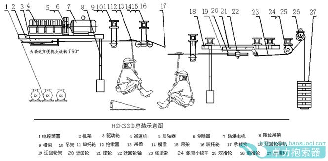 煤礦固定抱索器架空乘人裝置(以下簡(jiǎn)稱乘人裝置)是煤礦井下輔助運(yùn)輸設(shè)備,是煤礦斜井和平巷運(yùn)送人員上下的專用工具。它主要由驅(qū)動(dòng)部分、托繩部分、乘人部分、尾輪部分、張緊部分及電控部分組成。具有運(yùn)行安全可靠、人員上下方便、操作簡(jiǎn)單、維修方便、動(dòng)力消耗小、輸送效率高、一次性投資低等特點(diǎn)。是一種新型的現(xiàn)代化礦山人員輸送設(shè)備。
