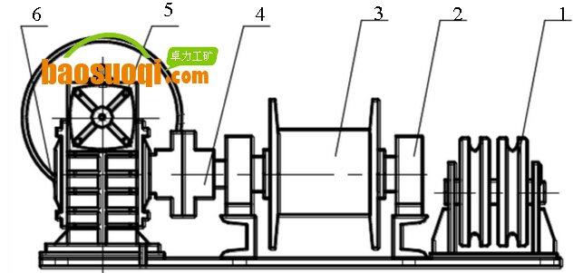 4.1 張緊絞車(圖8) 張緊絞車主要由雙滑輪1、軸承座2、卷筒3、聯(lián)軸器4、手輪5、減速器6組成 ,張緊絞車隨時(shí)調(diào)節(jié)行程,防止重錘落地和沖頂。