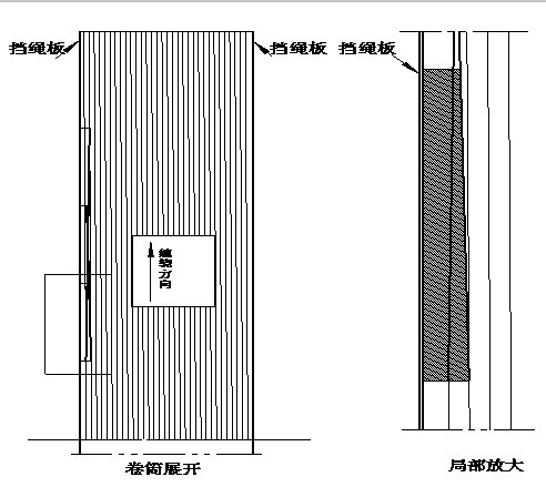 安裝步驟:在有負(fù)荷的狀態(tài)下將罐籠提升至提升機(jī)鋼絲繩距離擋繩板1.5-2圈時,將寫有1#字樣的過渡塊進(jìn)行試裝(2m以上提升機(jī)過渡塊可從2#開始試裝),按其鋼絲繩與擋繩板間隙的位置盡可能的向前(見圖2所示),做好標(biāo)記1#,繼續(xù)提升卷筒,將2#、3#……過渡塊依次放入試裝,繼續(xù)提升卷筒觀察鋼絲繩的運(yùn)行過渡情況并進(jìn)行調(diào)整。